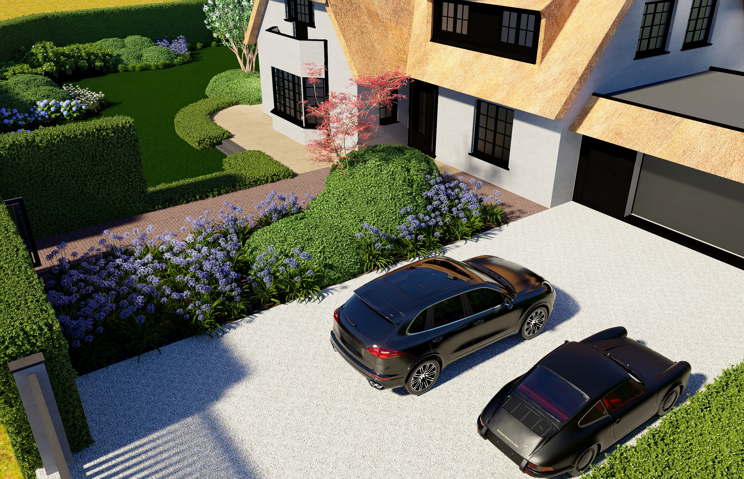 Het ontwerp van deze Gooische tuin draait om de kracht van eenvoud. Door een weloverwogen combinatie van materialen en beplanting ontstaat een stijlvolle buitenruimte waarin rust en luxe samenkomen. De tuin biedt geborgenheid en vormt een elegant verlengstuk van de woning.